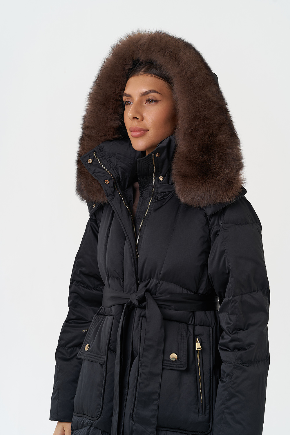 Крой воротника - капюшон, отделка песец под соболь