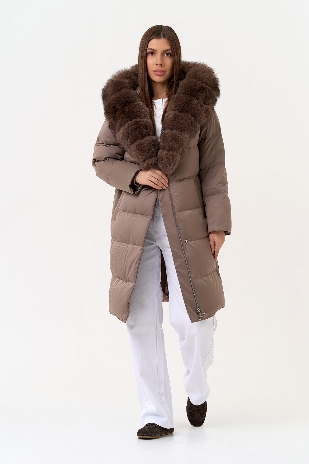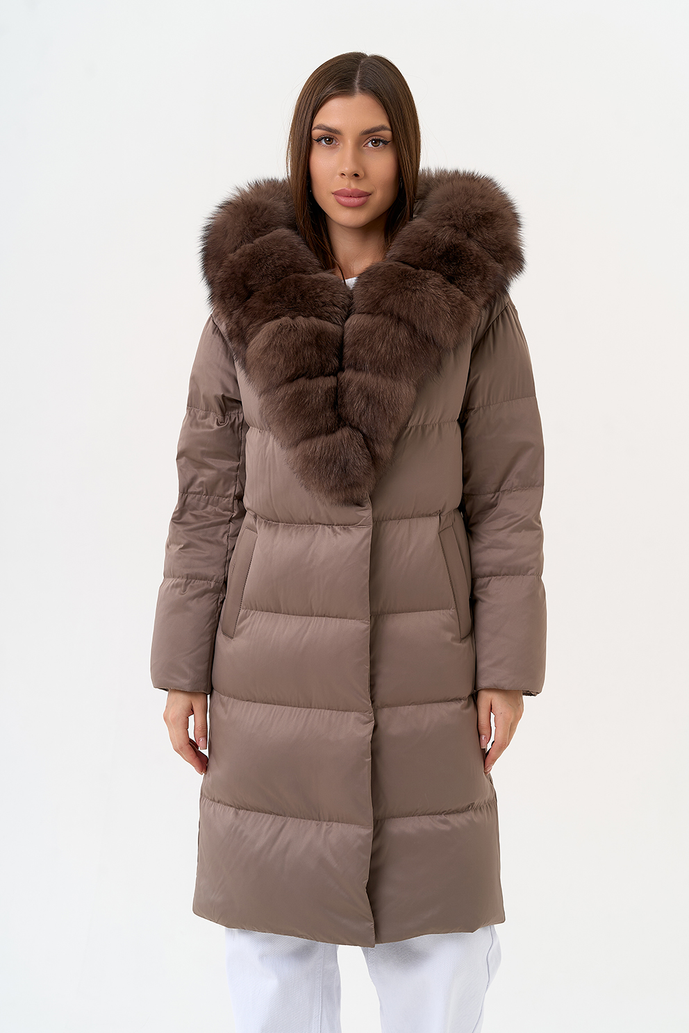 Крой воротника - капюшон, отделка мех песца